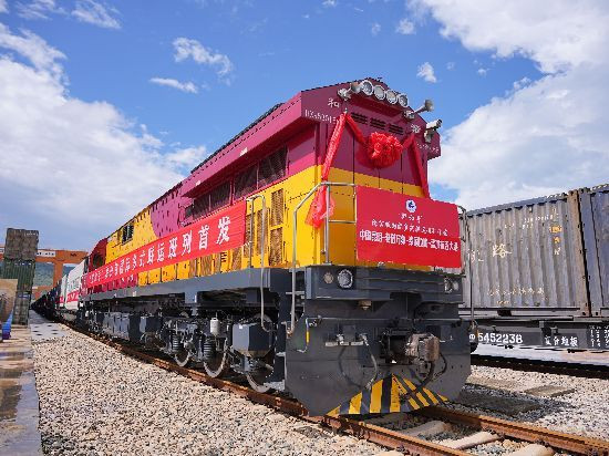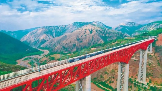 奔驰在老挝万象省境内欣楠里河特大桥的“澜沧号”动车组列车。